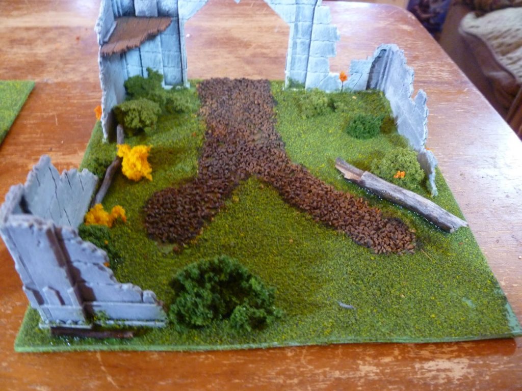 In the back there are two ruined buildings on 6″x6″ bases, one with a detached corner for more versatility. In the left front you can see a full set of the statues and broken columns from a terrain pack. In the right front there are two unpainted statues from the Ruins of Osgillitath set and an extra broken statue from the terrain pack, also unpainted. The unpainted pieces I will keep on hand and work into some of the other upcoming pieces. The rest I will be updating with the “Autumn” look.
